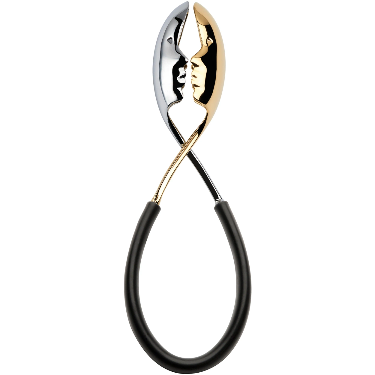 Efektowne szczypce do sałaty z twarzami skierowanymi do siebie w geście pocałunku. Jedna z twarzy jest pokryta 24-karatowym złotem. Uchwyt z tworzywa sztucznego w kolorze czarnym. Designerski i praktyczny element na Twoim stole - możesz w sposób wygodny zaserwować ulubioną sałatkę jedną ręką!