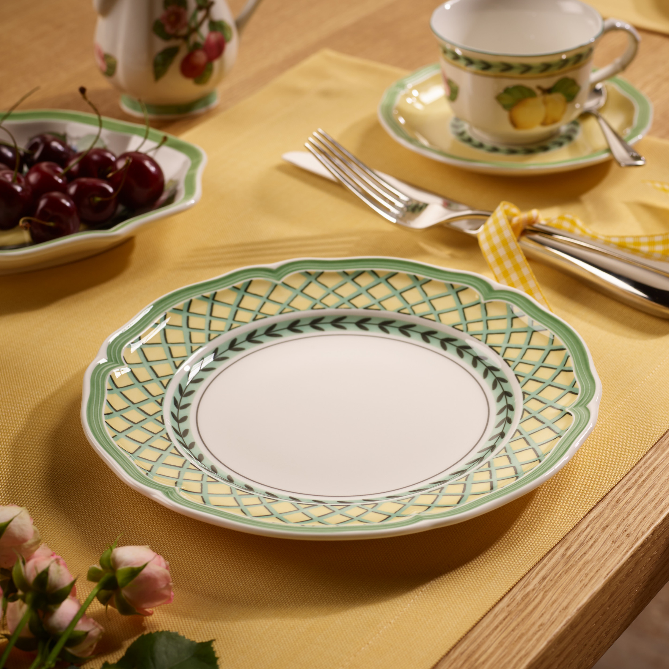Porcelanowy talerz sałatkowy o średnicy 20.70 cm z kolekcji French Garden od Villeroy & Boch. Ekskluzywne naczynia w stylu rustykalnym: kolekcja French Garden z Villeroy&Boch prezentuje się jako zastawa stołowa wykonana z wysokiej jakości porcelany. Owocowe motywy przypominają ostatnie wakacje na słonecznym południu Europy. Naczynia z French Garden są obecnie dostępne w czterech kolorach. We wszystkich rozwiązaniach dominują ciepłe odcienie kolorów; zielonego i żółtego. Dekory Fleurence, Vienne, Valence i Orange oferują swobodę twórczą do łączenia i dopasowywania. Kolekcja French Garden zawiera przydatne akcesoria kuchenne, których wygląd podkreśla idylliczny charakter.