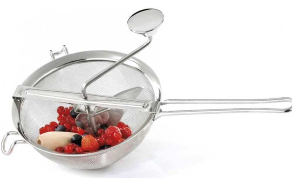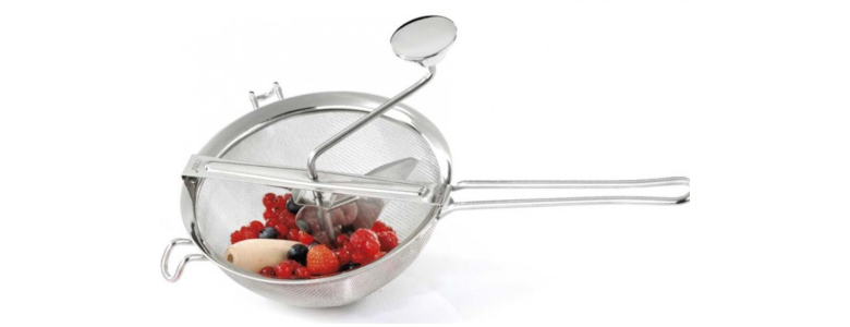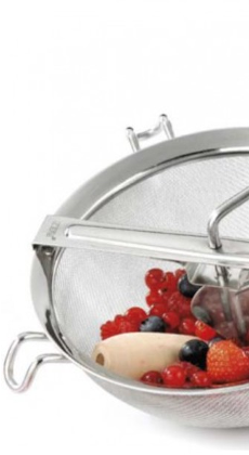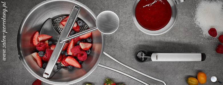Przecierak z sitem z drobna siatką może być użyty do przeciskania owoców i warzyw, bezpieczny ergonomiczny uchwyt, wysokiej jakości stal nierdzewna, produkt nadaje się do mycia w zmywarce, 5- letnia gwarancja